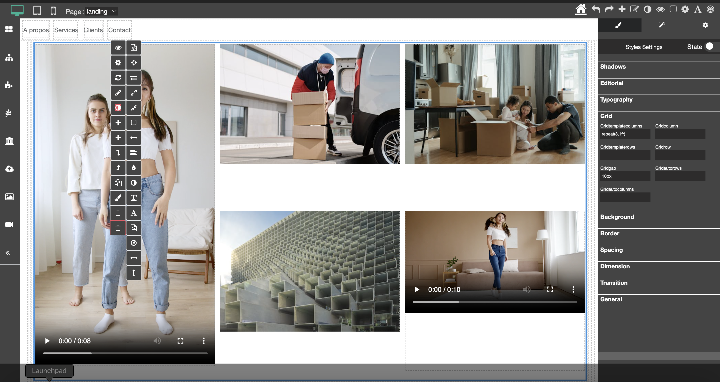 Le paramétrage des propriétés Css se fait directement dans l'éditeur dans la section Grid situé sur le menu latéral droite.