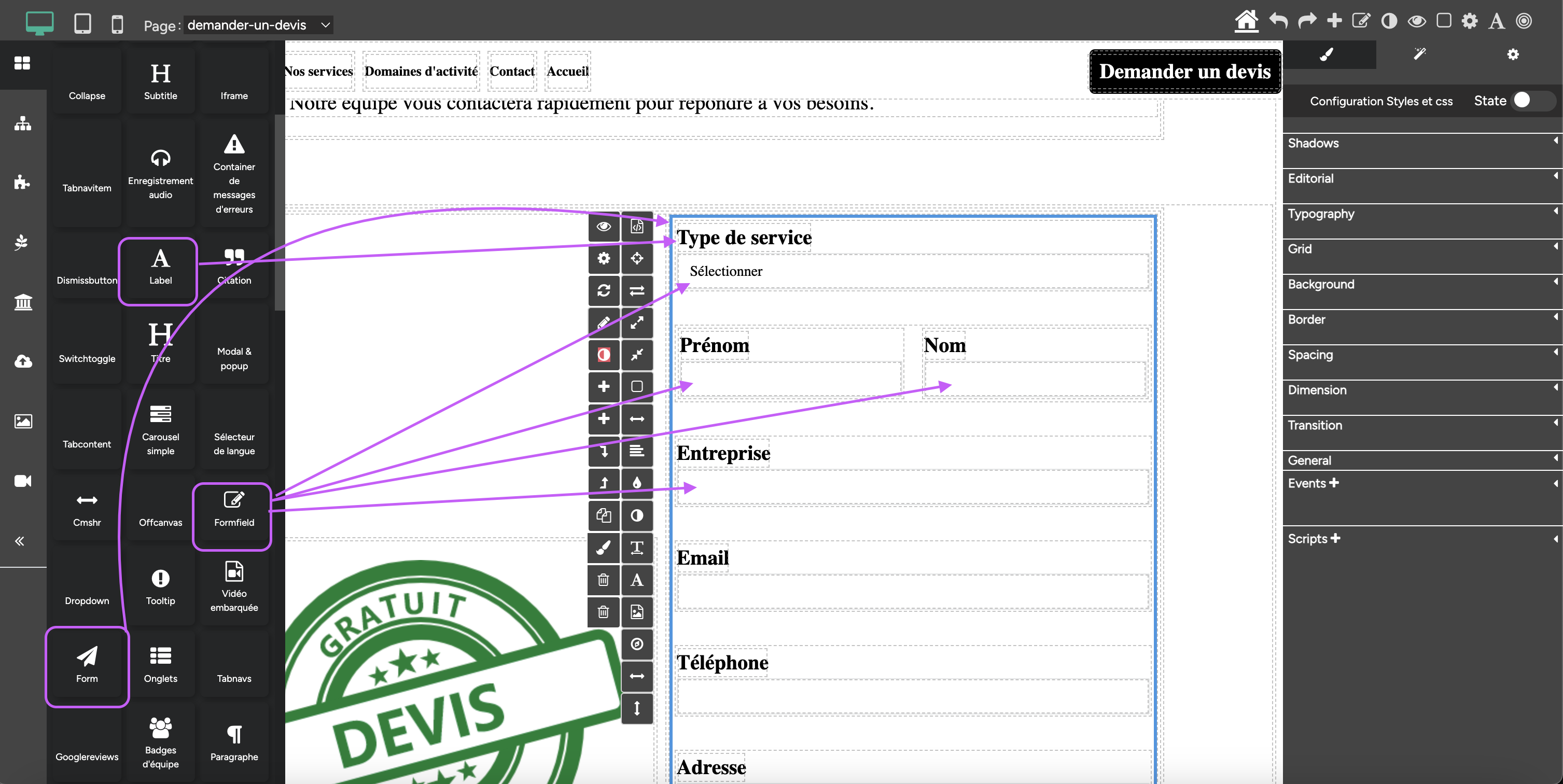 Les formulaires sont des composants qui permettent aux utilisateurs de soumettre des à votre système. Exemple : un formulaire de devis, un questionnaire.
